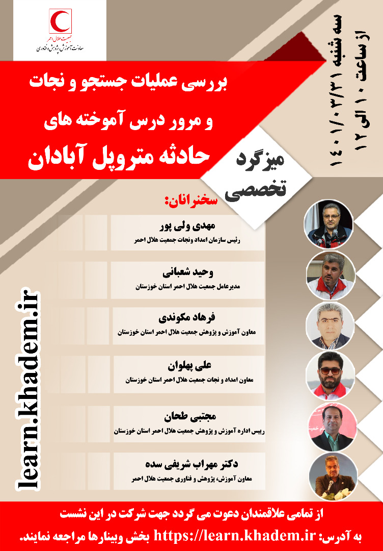 وی افزود: این وبینار آموزشی با همکاری جمعیت هلال احمر استان خوزستان با معاونت آموزش، پژوهش و فناوری در مورخ 31 خردادماه جاری در فضای مجازی به آدرس learn.khadem.ir در بخش وبینارها از ساعت 10 الی 12 برگزار خواهد شد.