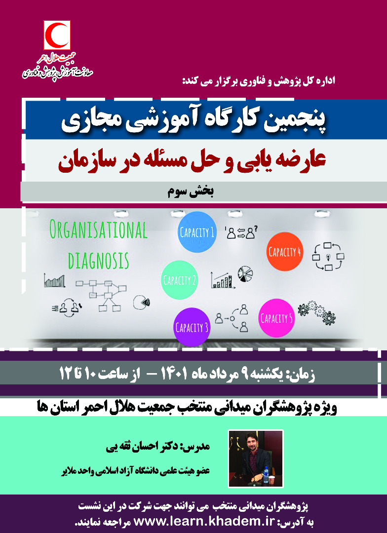 به گزارش روابط عمومی معاونت آموزش، پژوهش و فناوری جمعیت هلال احمر؛ دکتر پیمان صابریان بیان کرد: بخش سوم پنجمین کارگاه آموزشی مجازی عارضه یابی و حل مسئله در سازمان ویژه پژوهشگران میدانی منتخب جمعیت هلال احمر استانها برگزار میشود.